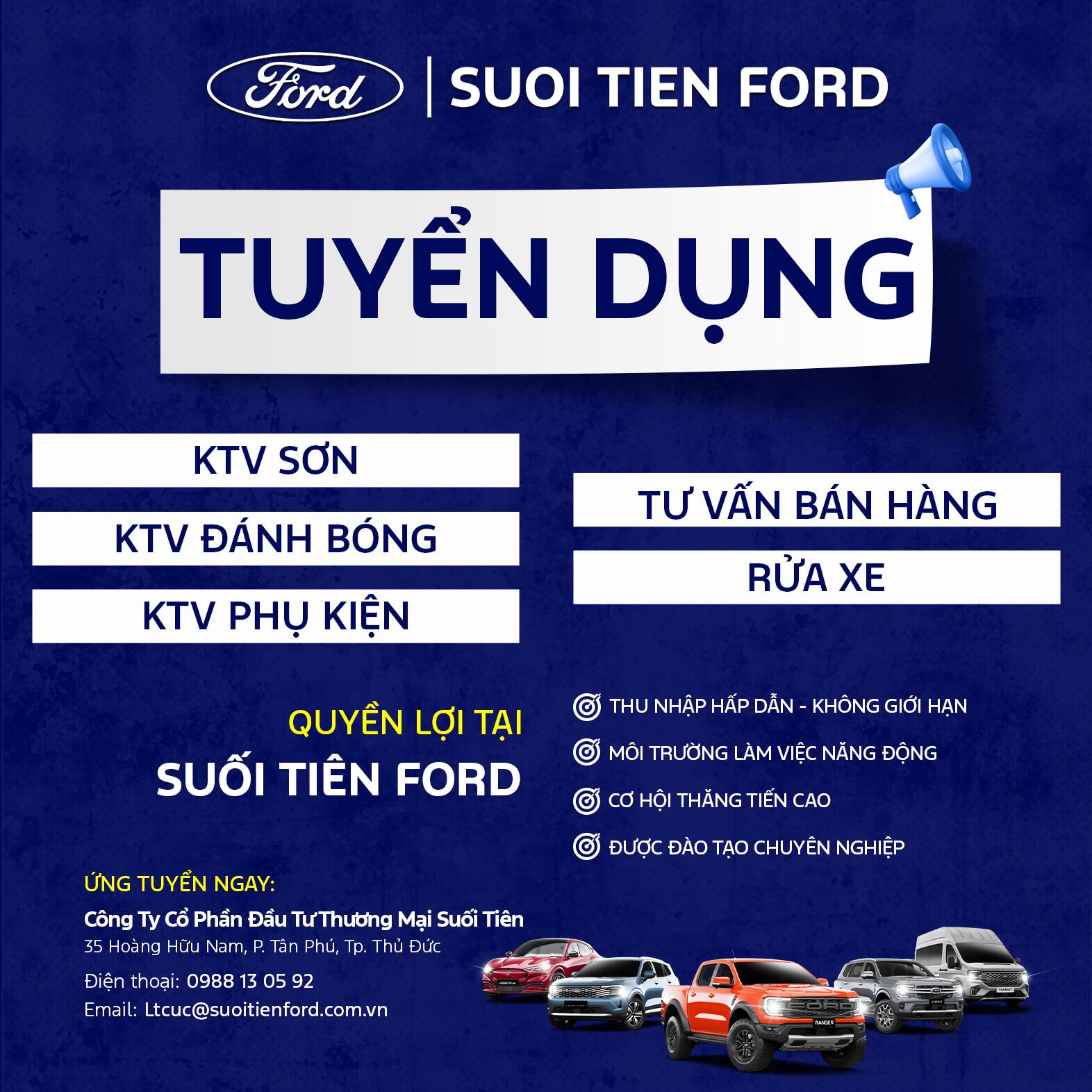 Công Ty Cổ Phần Đầu Tư Thương Mại Suối Tiên, Đại lý ủy quyền chính thức của Ford Việt Nam, với môi trường làm việc chuyên nghiệp cần tuyển ứng viên cho các vị trí với mức lương thưởng hấp dẫn.