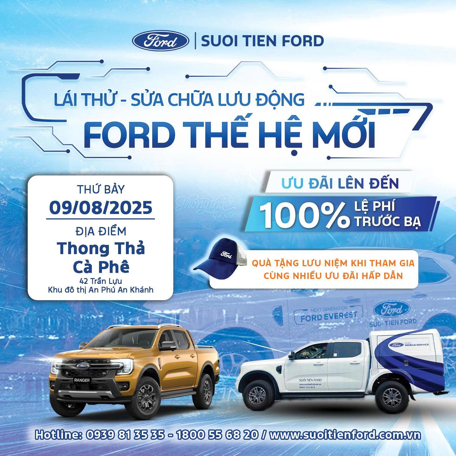 Chương trình "LÁI THỬ TRẢI NGHIỆM VÀ SỬA CHỮA LƯU ĐỘNG XE FORD" được tổ chức nhằm mang lại trải nghiệm và dịch vụ tiện lợi nhất cho khách hàng, không cần phải đi xa nhưng vẫn có thể chăm sóc xế yêu của mình cũng như trải nghiệm những dòng xe Ford ngay tại địa điểm cafe quen thuộc.